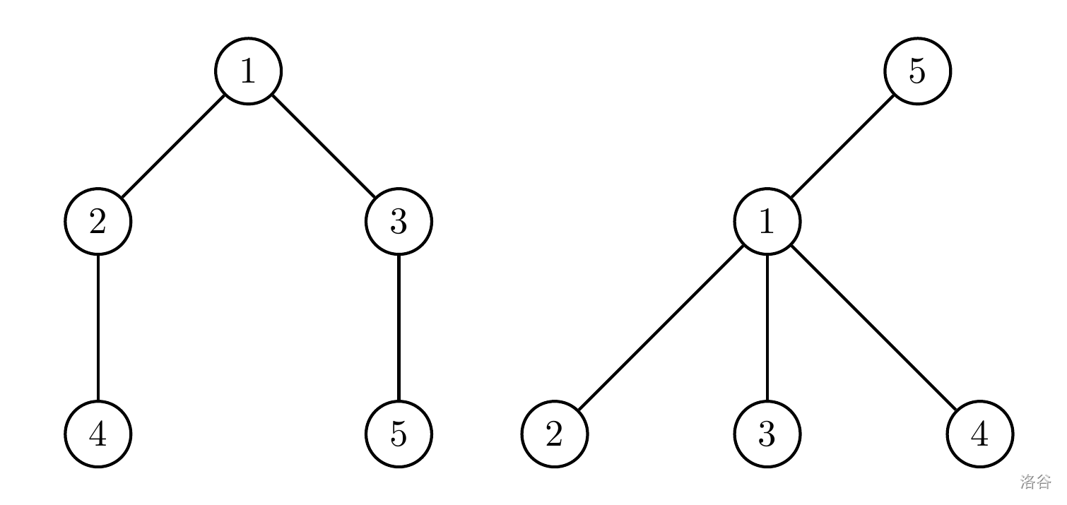 上圖為範例測試資料一和二所給定的兩棵有根樹,左邊的樹以節點 為根、右邊的樹以節點 為根。以節點對 為例,我們可知在左樹 ,節點 移動到節點 需要兩步,但節點 移動到節點 只需要一步,因此他們在左樹的祖先關係距離為 。注意到因為節點對 在右樹互為祖先關係,當 時,節點對 會被視為有差異的節點對,同理,節點對 以及 都是有差異的節點對,因此,上圖中的兩棵樹在 時的距離函數值為 ;而當 時,只有 因在左樹的祖先關係距離為 會被視為有差異的節點對,距離函數值僅為 。