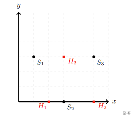如下圖為一 n=3 且 m=3 的例子,其中正方形的點 H1,H2,H3 分別代表房屋 1,2,3,圓點 S1,S2,S3 則分別代表捷運站 1,2,3 的位置。並且: