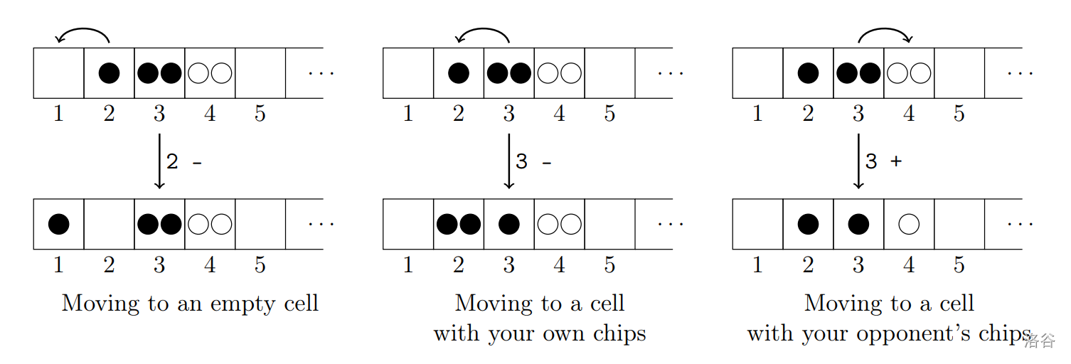 In the first and third cases, specifies any winning or drawing move, respectively --- that is, a move after which, with perfect play from the second player, there remains a possibility to win or draw the game. Here, is the coordinate of the red chip that the first player should move, and is the direction of the move ( means the chip should be moved to cell , and means the chip should be moved to cell ). If is , then must be greater than . If you suggest that the first player skips their turn, print instead of .