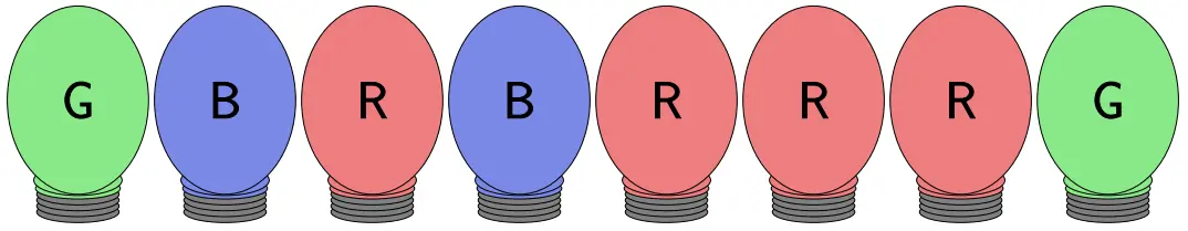Mei's parents have spent the last year remodeling their house, but their lighting system is quite complex! Each room in the house has an LED light, which can be set to red, green, or blue, as seen in Figure G.1.