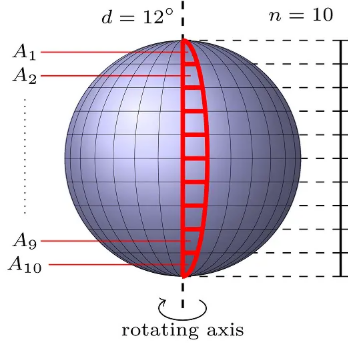 The analysis proceeds in steps of degrees. In one step, data is aggregated while the planet rotates by degrees, so each step gives information about a slice of degrees of the planet's surface. The image is split into segments of equal height, which are analyzed separately. So the slice of degrees is partitioned into areas . For each area , image analysis produces a number that gives the percentage of covered by water. The areas for one step are highlighted in the diagram on the right.