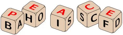 Suppose there are five dice: one of them contains letters A, B, C, D, E, and P (abbreviated as ABCDEP), and the other dice contain letters AEHOXU, AISOLR, ABCDEF, and ABCSCC. The first roll yields the following letters on the tops of respective dice: P, X, R, E, and S. As it is impossible to arrange these letters into a valid word, you decide to keep the P, S, and E, and reroll the other dice, in an attempt to make words like PARSE, PAUSE, PHASE, POISE, PROSE, PULSE, or PURSE. The two dice yield E and A, resulting in the following five letters: P, E, A, E, and S. You still cannot think of a valid word, so you decide to keep four letters and reroll only the last die, which has three sides with letter C. By doing so, there is a chance that it will be possible to make a final valid word: PEACE, as shown in Figure K.1.