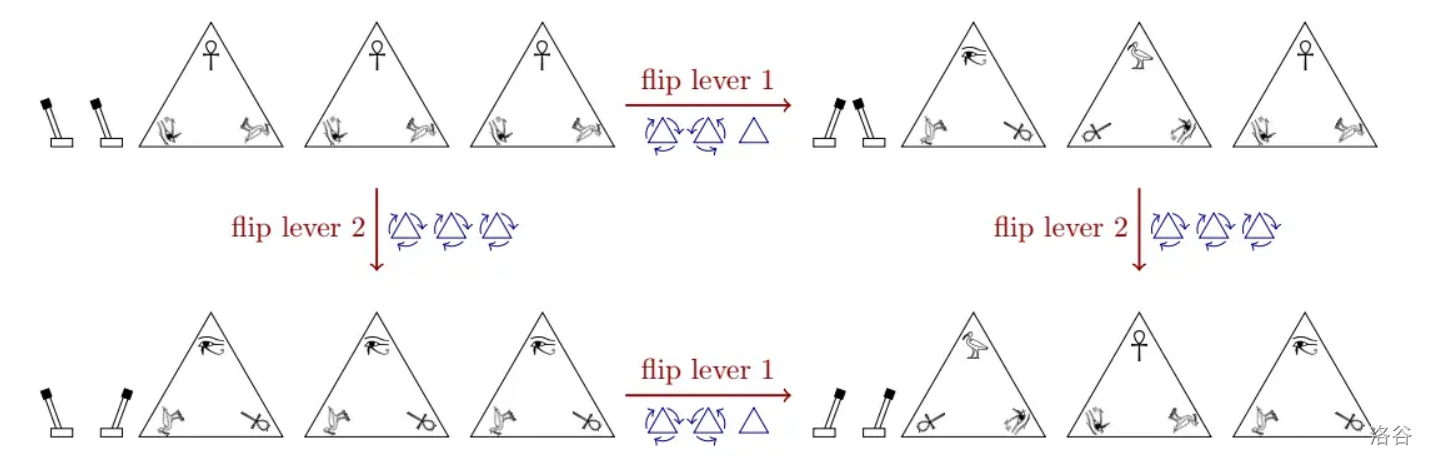 Next to the wall there are levers. Cautiously experimenting with these, wary of potential traps, the professor realizes that each lever rotates some of the pyramids clockwise or counter-clockwise so that another hieroglyph is pointing upwards on them. Flipping back a lever rotates the same pyramids in the opposite direction back to their original position. The levers operate completely independently of each other, so flipping or unflipping a lever has the same effect regardless of what states the other levers are in. See Figure Z.1 for an illustration.