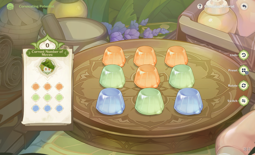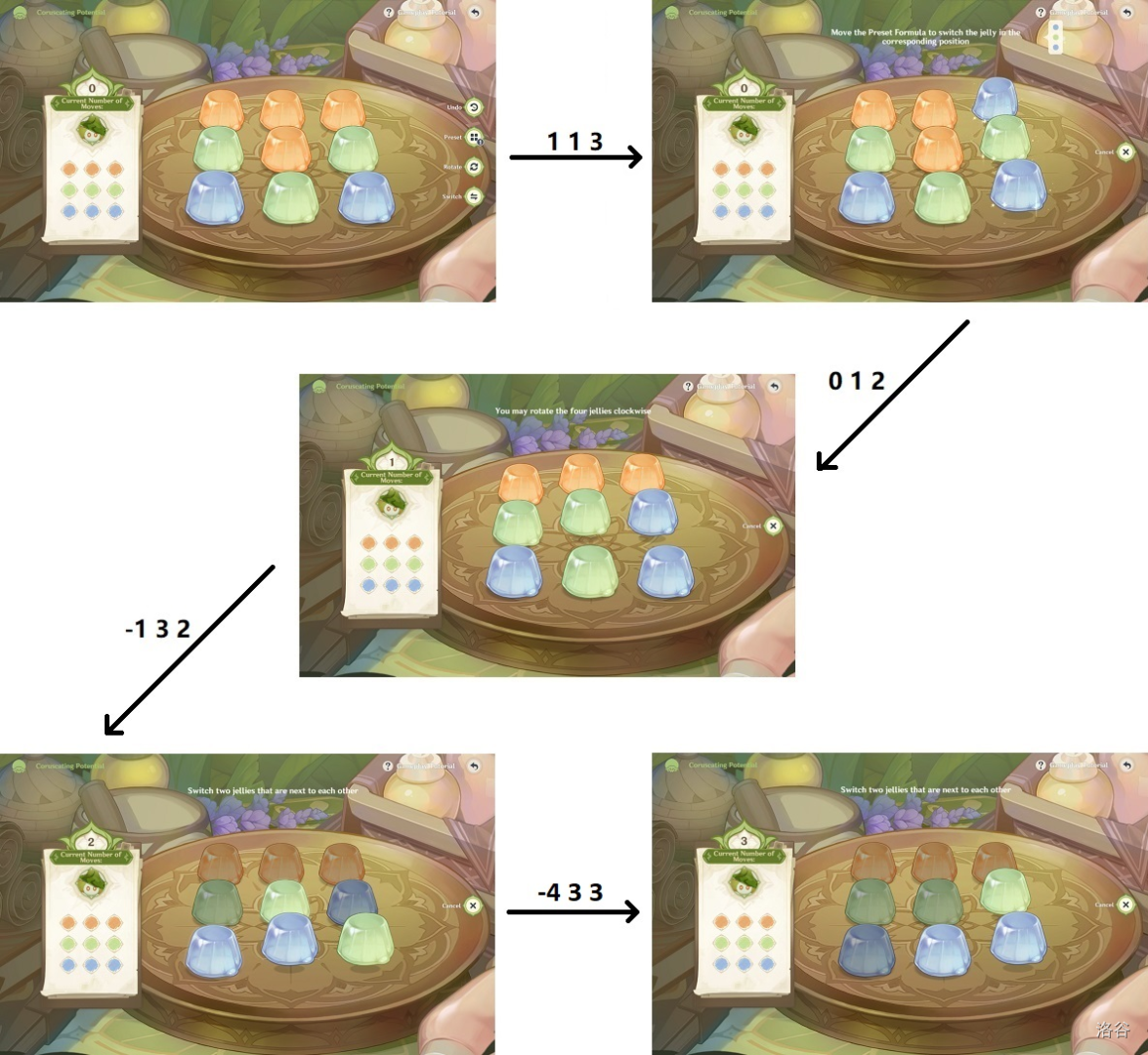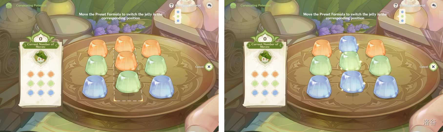 挑战指定了最终需要形成的花花琼脂目标组合。也就是说,在完成所有操作之后,矩阵里每个位置的花花琼脂的类型都必须和目标组合的相应位置一致。
