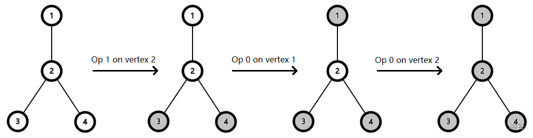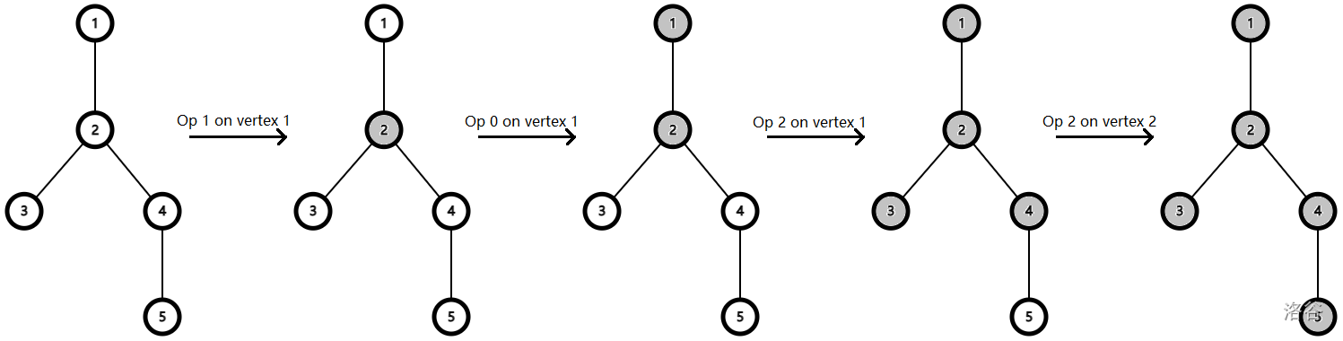 为了帮助您达成目标,我们提供 种操作,编号从 到 (含两端)。操作 ()需要您首先选择一个节点 ,之后将所有满足以下条件的节点 染成黑色: