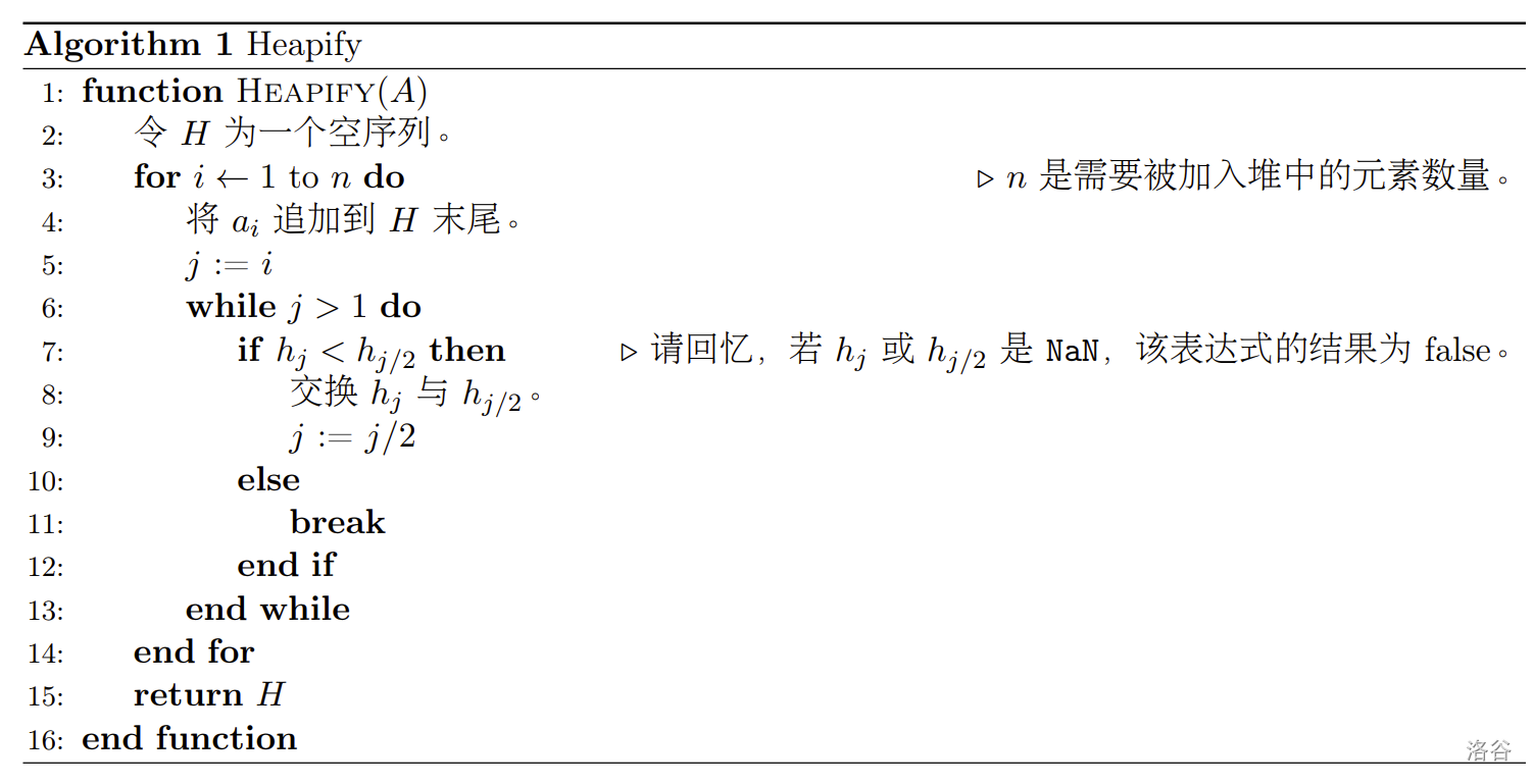 $$\begin{array}{|c|c|c|c|c|c|c|} \hline \textbf{比较} & \texttt{NaN} \ge \texttt{x} & \texttt{NaN} \le \texttt{x} & \texttt{NaN} > \texttt{x} & \texttt{NaN} < \texttt{x} & \texttt{NaN} = \texttt{x} & \texttt{NaN} \ne \texttt{x} \\ \hline \textbf{结果} & False & False & False & False & False & True \\ \hline \end{array} $$堆是一种数据结构,可以用具有特殊性质的序列表示。以下算法展示了如何将 个浮点数 按顺序加入小根堆 中,其中 是一个初始为空的序列。