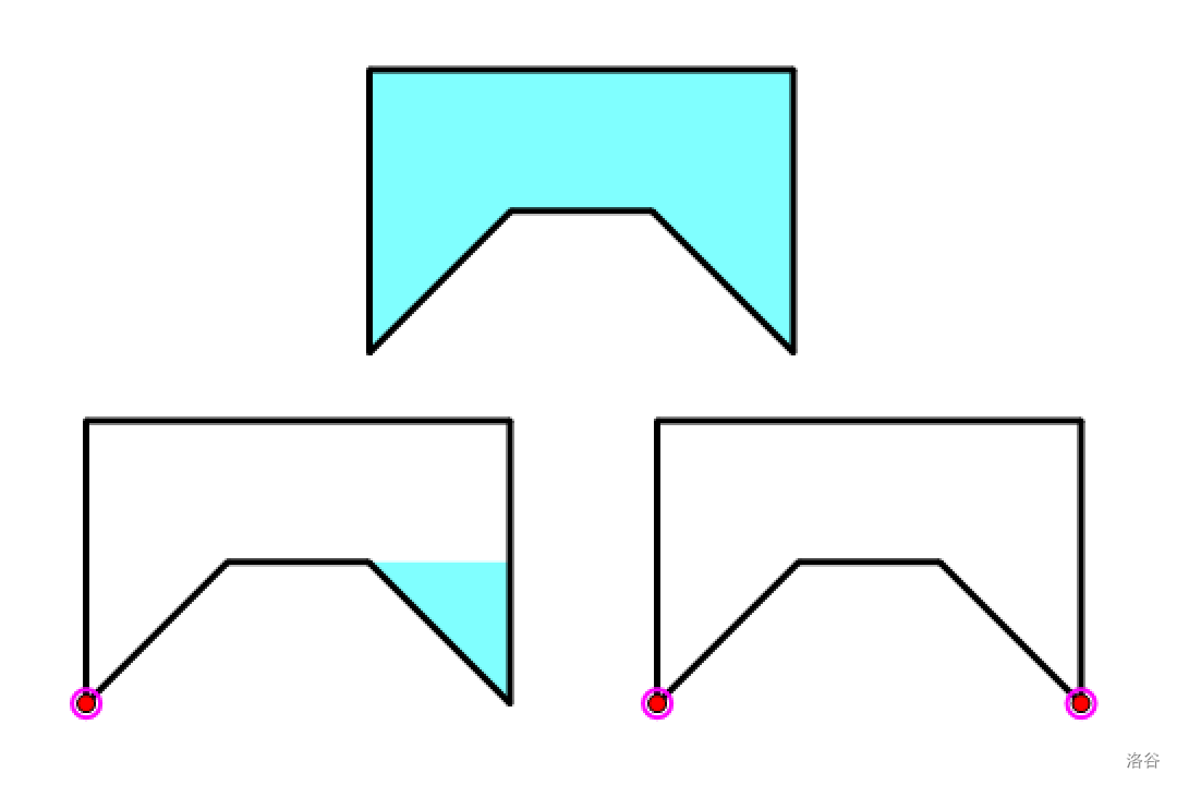 如上图所示,紫色的点代表阀门,而浅蓝色区域代表阀门全部打开后水箱内剩余的水。