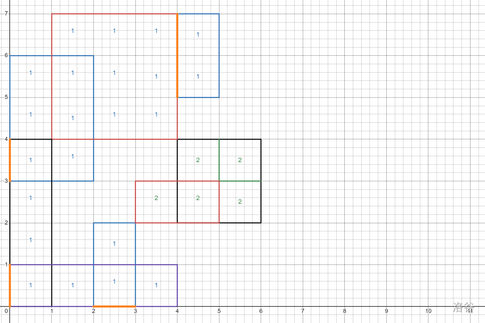 橙色加粗的线段表示这里有重合的部分,每一个方形中间的数字表示所属的块的编号。