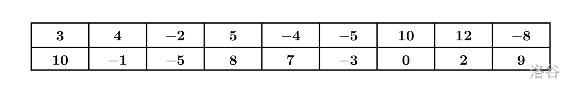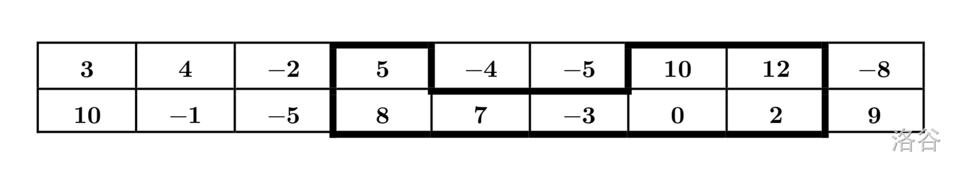 第一行有一个整数 ,表示登陆地带的大小是 。随后的两行每一行有 个整数(其绝对值不超过 ),表示对应的矩形土地的适用度评估值,各个整数之间用一个空格隔开。