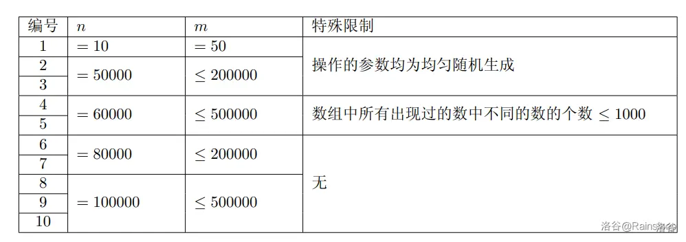 第一行两个正整数 ,表示长度为 的数组,共 个操作。接下来 行每行表示一个操作: